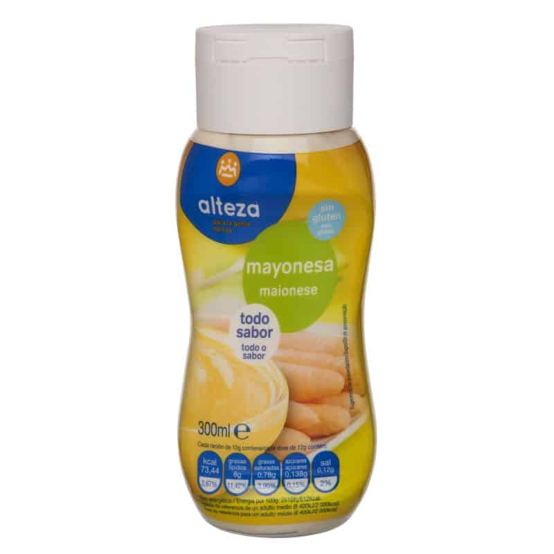 Mayonesa en bote especial bocaabajo de la marca Alteza de 300 gramos, hecha a partir de huevos de origen nacional, y con aceite de girasol. Este bote de mayonesa es apto para celíacos e intolerantes a la lactosa puesto que se fabrica sin derivados que contengan gluten ni leche.